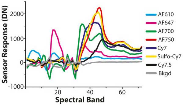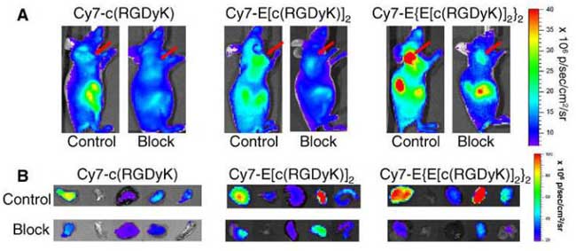 对于一些需化学方法进行标记的物质,比如化学合成药物、纳米药物及一些肽段等,只能通过化学合成的方法与荧光染料进行偶连,检测荧光的发光情况,从而实现活体示踪的目的。目前应用较多的是对于一些肿瘤靶向药物在活体内靶点的识别、研究蛋白质-蛋白质相互作用以及跟踪化学药物在体内的分布及代谢情况等。例如用CY5.5及CY7标记RGD肽段,研究其在尾静脉注射不同时间里对移植胶质瘤中细胞粘附分子Intergrin的特异性识别过程。在肿瘤药物相关研究中,用CY5.5标记两种脱氧核糖类似物CY5.5-2DG及CY5.5-NHS均可在小鼠活体水平上直接观测到其对肿瘤的特异性识别作用。