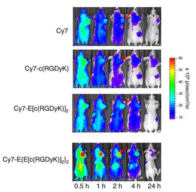 图3  注射500 pmol Cy7、Cy7-c(RGDyK)、Cy7-E[c(RGDyK)]2、 or Cy7-E{E[c(RGDyK)]2}2的皮下U87MG肿瘤小鼠在2min、30min、1h、2h、4h、24h时间内的全身NIR荧光成像