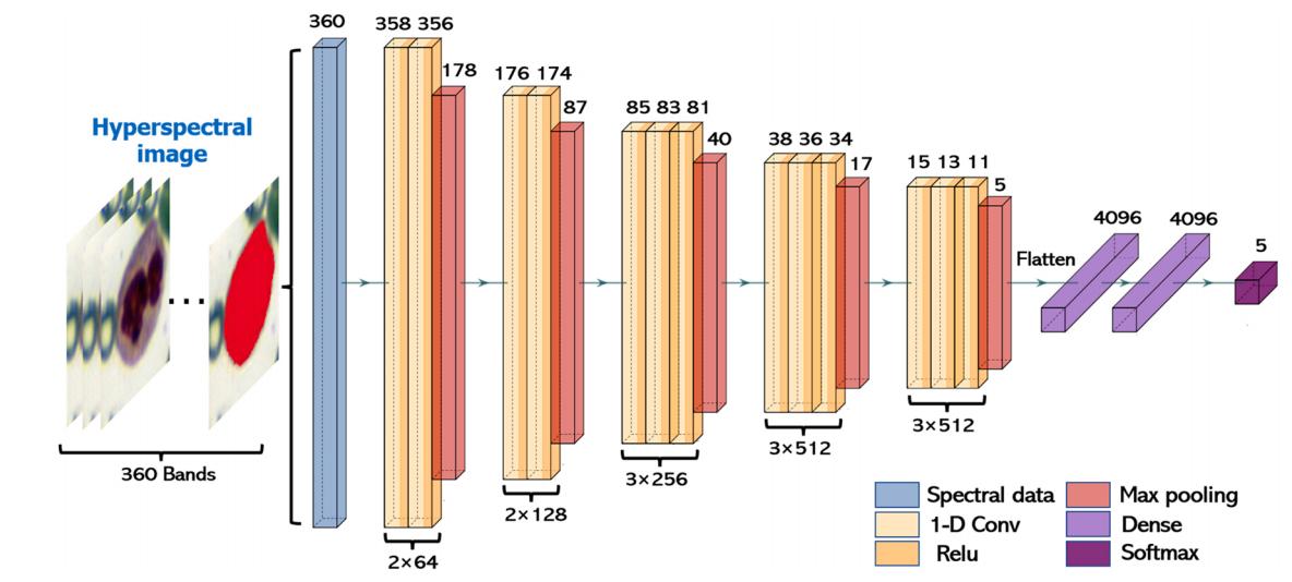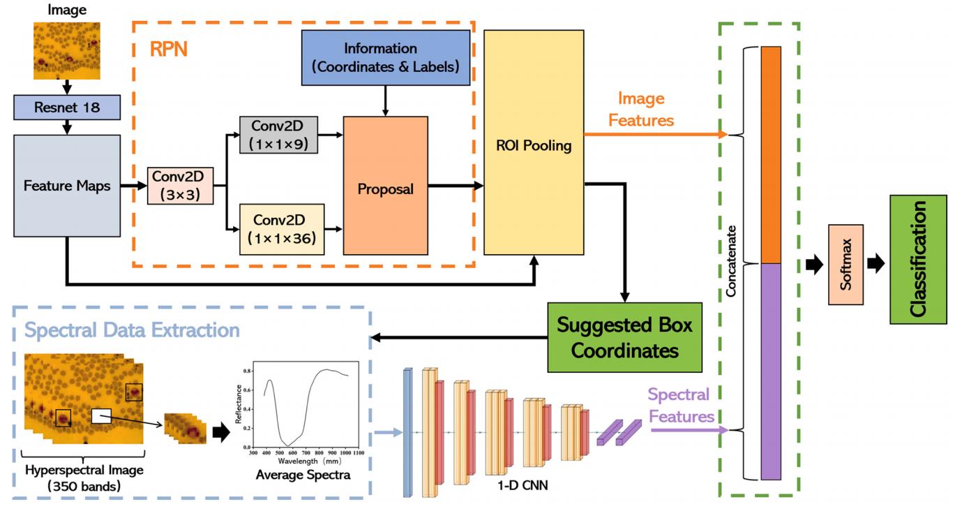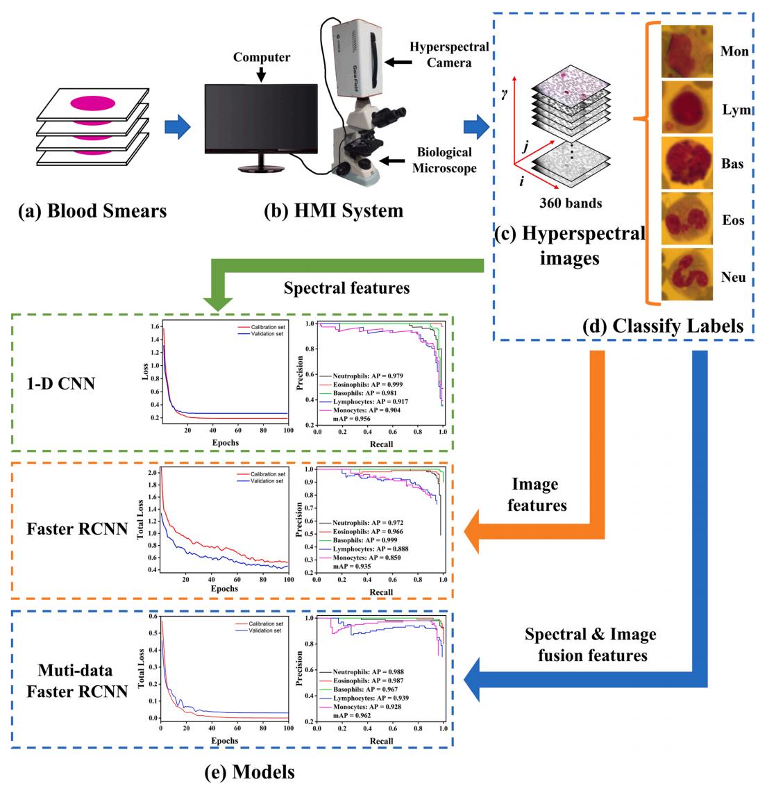 具体研究内容如下:(1)利用高光谱显微成像(Hyperspectral microscopic imaging, HMI)系统获取血液涂片中含有白细胞区域的影像,并对每种类型的白细胞进行标记,形成五种分类的数据集。(2)根据VGG16网络架构构建一维CNN网络,并基于WBC的光谱数据进行相应的训练和预测,验证光谱数据作为WBC分类依据的可行性。(3)与一维CNN相似,采用Faster RCNN作为对照组,基于伪彩色图像对WBC进行识别分类,观察基于单一数据的分类准确率。(4)最后,构建了基于图像和光谱特征的多数据Faster RCNN深度学习模型,并探讨多数据联合在白细胞检测中的可行性和优势。