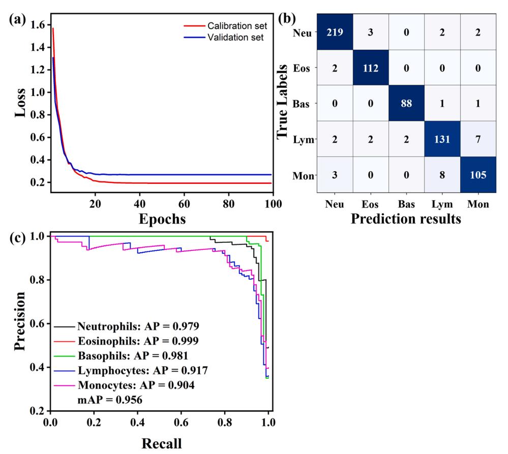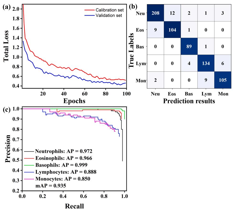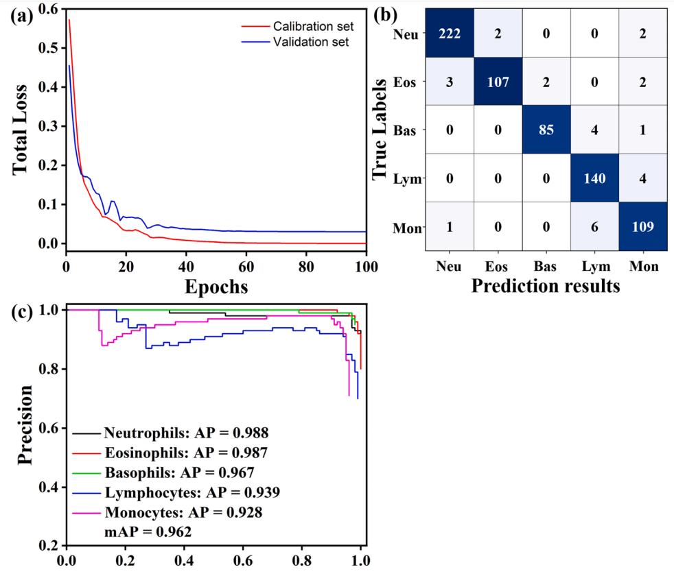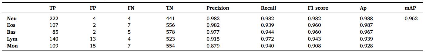 图8显示了基于Faster RCNN的5种WBC类别在两种不同图像下的检测结果。图9展示了Faster RCNN模型的具体分类结果。从模型训练的角度来看,总损失在20次迭代之前迅速下降,80次迭代之后趋于平缓,基本收敛,这证明了Faster RCNN在本WBC图像数据集中是可行的。与一维CNN相比,Faster RCNN不仅在训练过程中收敛速度更慢,而且在Neu和Eos中的分类准确率也要低得多。然而,由于Lym的形态特征与Neu和Eos有很大的不同,因此不会与这两者混淆。
