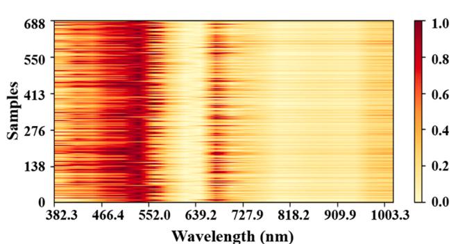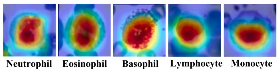 多数据Faster RCNN在预测集中得到的CAM图如图12所示。与单一数据一维CNN聚焦的400 ~ 570 nm和640 ~ 700 nm波段范围相比,多数据Faster RCNN模型在融合特征的指导下,聚焦的波段范围分别为380 ~ 570 nm和640 ~ 950 nm。同时,与单一数据Faster RCNN相比,背景的注意区域明显变窄,暗红色区域更集中在核区。这表明该模型更关注细胞的各种特征,而不是背景,有利于在复杂情况下准确检测白细胞,提高模型的泛化能力。