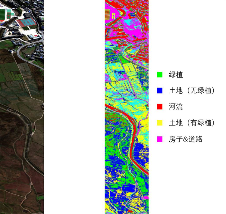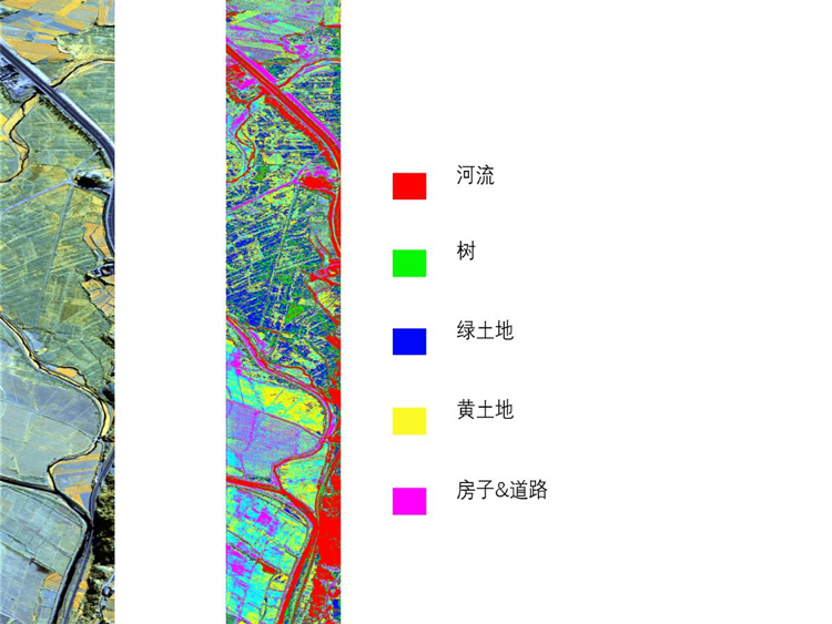 (2) 对于地表覆盖的探测和识别能力极大提高。高光谱数据能够探测具有诊断性光谱吸收特征的物质,能准确地区分地表植被覆盖类型和道路地面材料等。