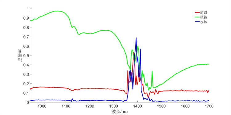 (2)近红外900-1700nm波段高光谱相机数据处理结果,如图10和图11所示。(注:在1400nm附近是水汽吸收窗口)