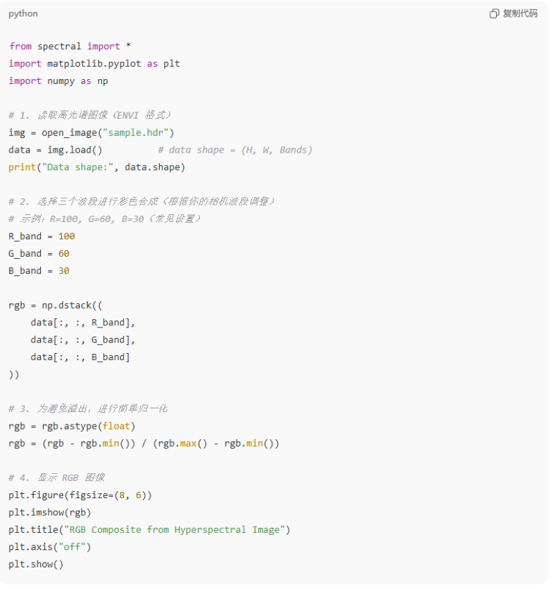 高光谱数据的读取及可视化,可以使用集成好的高光谱遥感软件直接处理,亦可使用python或MATLAB等自行编程读取处理,原始高光谱曲线是DN值信息,DN 就是相机探测器把光信号转成的数字值,本质上是“像素灰度”。它不是物理量,因此需要转换为反射率或辐射度数据在进行数据分析处理。以下为简单代码读取案例。
