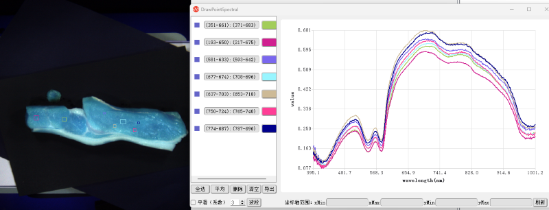 在软件中点击任意位置即可看到其光谱反射率/辐亮度随波长变化情况。亦可选择区域及无规则图像,将roi等的所有像素点进行平均。