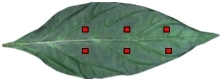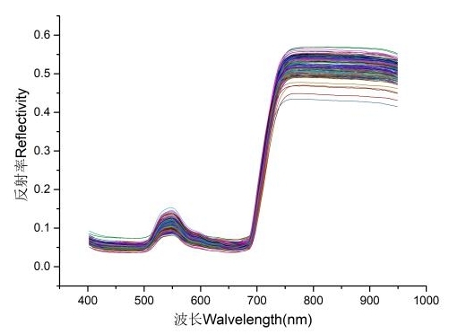 通过选取如图3所示的6处具有代表性的矩形感兴趣区(避开叶脉)作为样本的原始光谱,加权平均后的光谱值作为原始光谱数据。去掉383~399 nm和950~1000 nm边缘噪声较大的光谱数据,保留400~949 nm进行下一步研究(如图4所示)。