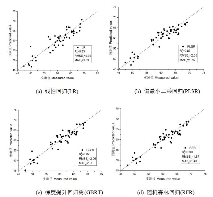 将经随机森林特征选择算法筛选后的波段作为自变量,SPAD值作为因变量。利用线性回归(Linear Regression, LR)、偏最小二乘回归(Partial Least Squares Regression, PLSR)、梯度提升回归树(Gradient Boosting Regressor Tree, GBRT)、随机森林回归(Random Forest regression, RFR)分别构建反演模型。表1为4种模型的建模效果精度对比,图6为4种模型的验证集验证效果。