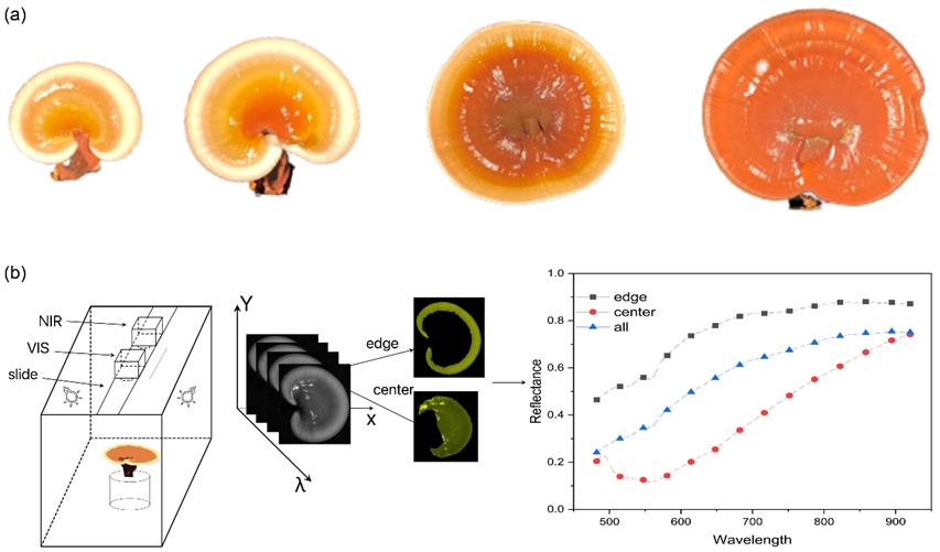 华南农业大学电子工程学院(人工智能学院)赵静副教授团队,对我司可见-近红外高光谱相机(GaiaField Pro-V10E)和近红外双高光谱相机(GaiaField Pro-N17E)采取联用的形式,采集灵芝(赤芝)实体402.6-1005.5nm和887-1703nm的高光谱图像,并获取其多糖含量。图1(a)为不同采摘时期的灵芝RGB图片,图1(b)为高光谱图像采集系统及获取数据流程。
