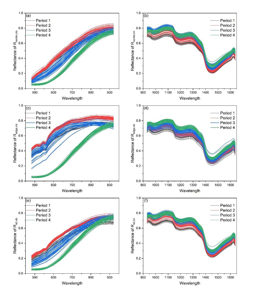 图2 不同ROI和光谱范围的光谱反射率。(a)可见光中心区域的反射率,(b)近红外中心区域的反射率,(c)可见光边缘区域的反射率,(d)近红外边缘区域的反射率,(e)可见光子实体整体的反射率,(f)近红外子实体整体的反射率。