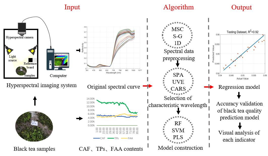 山东农业大学丁兆堂教授团队利用我司高光谱成像设备(Gaia field Pro-V10),采集了茶鲜叶萎凋和发酵过程中的高光谱数据,同时测定了各茶叶样本中的TPs(茶多酚)、FAA(游离氨基酸)和CAF(咖啡因)含量;采用卷积平滑法、多元散射校正和一阶导数算法对高光谱数据进行预处理;通过机器学习和多种算法构建了TPs、FAA和CAF含量的监测模型。试验流程如图1所示: