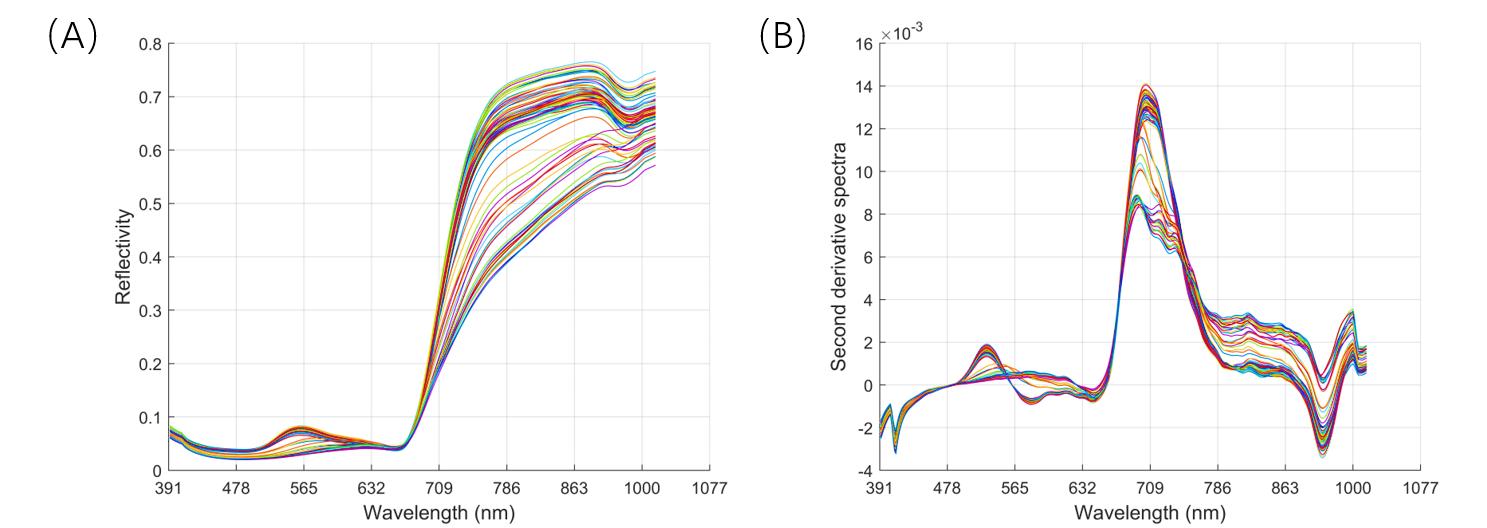 (A)茶叶样本原始光谱图 (B)MSC+1D+S-G算法预处理后的光谱图