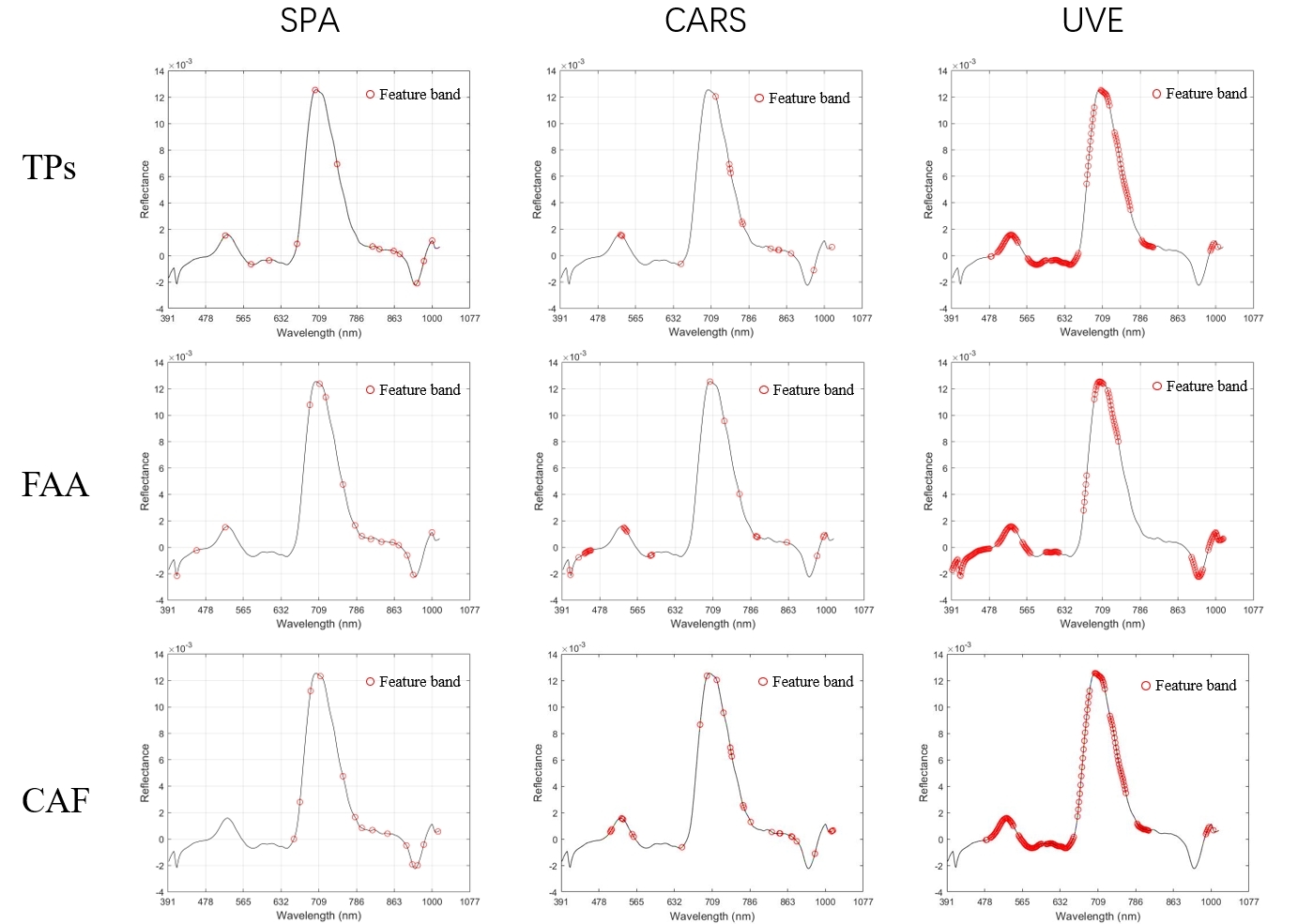 图2表示高光谱数据预处理前后的光谱图,提高了光谱数据与茶叶品质成分之间的相关性。然后采用连续投影算法(SPA)、竞争性自适应重加权(CARS)和无信息变量消除(UVE)方法,选择特征波段。特征波段的筛选结果如图3所示。