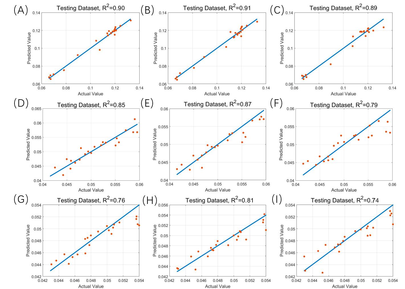 (A、B、C)通过CARS-SVM、CARS-PLS、CARS-RF模型获得的TPs含量预测结果 (D、E、F)通过CARS-SVM、CARS-PLS、CARS-RF模型获得的FAA含量预测结果 (G、H、I) 通过CARS-SVM、 CARS-PLS、CARS-RF模型获得的CAF含量预测结果