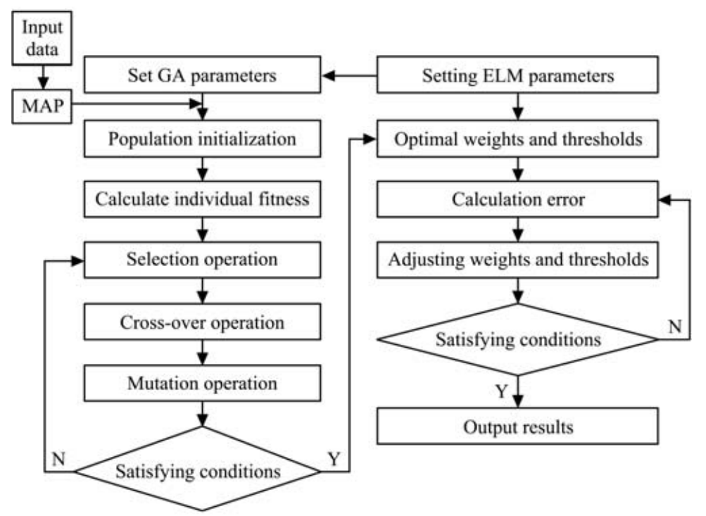高光谱遥感系统获取的全波段光谱中含有大量与水稻氮素含量无关的冗余信息,导致反演模型建立过程中模型误差增大。因此,本研究利用海洋捕食者算法(MPA)提取特征波段,并将其作为遗传算法(GA)的输入变量,进行变量筛选优化后,利用的极限学习机(ELM)进行建模以实现对水稻冠层氮素含量估测,具体流程如图2所示。