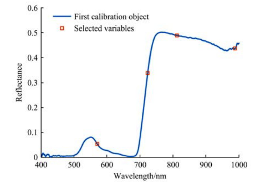 利用Savitzky-Golay卷积平滑算法对400 ~ 1000 nm的反射率光谱数据进行平滑处理,并利用MPA提取特征波段用于水稻氮素含量反演。图3为MPA算法的特征波段选择结果,最 佳特征波段为570、723、811和987 nm。本研究提取的特征波段主要集中在绿波段、红边位置、近红外波段范围。