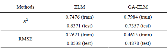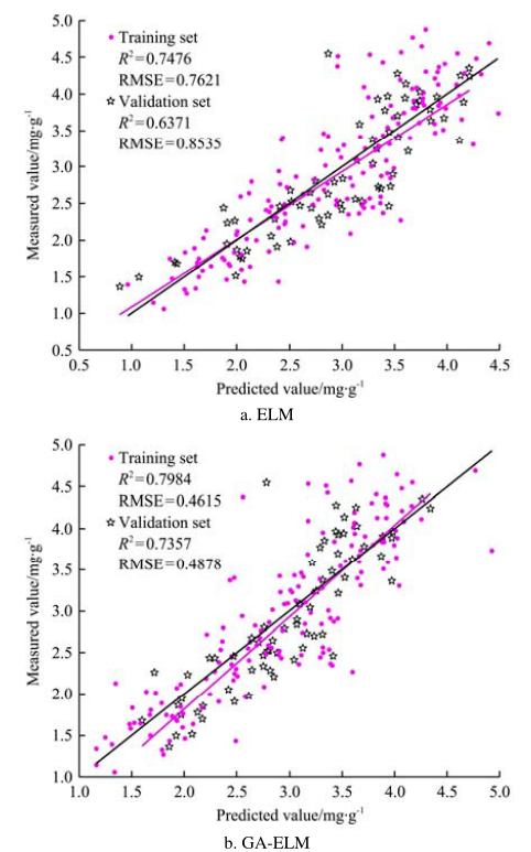 在两种建模方法建立的水稻氮素含量反演模型中,GA-ELM模型的反演效果优于ELM模型,训练集和验证集的R2均高于0.7357,RMSE均低于0.4878 mg/g,如图4所示。由表1可知,采用传统极限学习机算法的水稻氮素含量反演模型的模型精度弱于采用遗传算法的水稻氮素含量反演模型。主要在于单一的ELM模型,其参数是在建模时设定的,缺乏优化过程,即无法确定给定的参数是否是最 优解。而通过多目标函数优化算法,以计算值与真实值之间的误差大小为测量依据,不断迭代优化ELM模型参数,通过设置误差阈值确定ELM模型参数,从而提 高了水稻氮含量反演的精度。