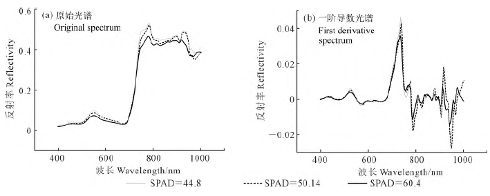 谷子叶片叶绿素含量在不同生育期呈先增加后减少的趋势,最大值出现在抽穗期,约为66.40。谷子叶片的光谱反射率变化趋势基本一致,而光谱反射率随着叶绿素的增加呈现出降低的趋势。近红外波段的光谱一阶导数可以显著地增强红边波段,红边波段的一阶导数光谱是整个波段范围的最大值,对应为反射率在600~800 nm的强吸收效应。谷子叶片反射光谱及一阶导光谱如图1所示。