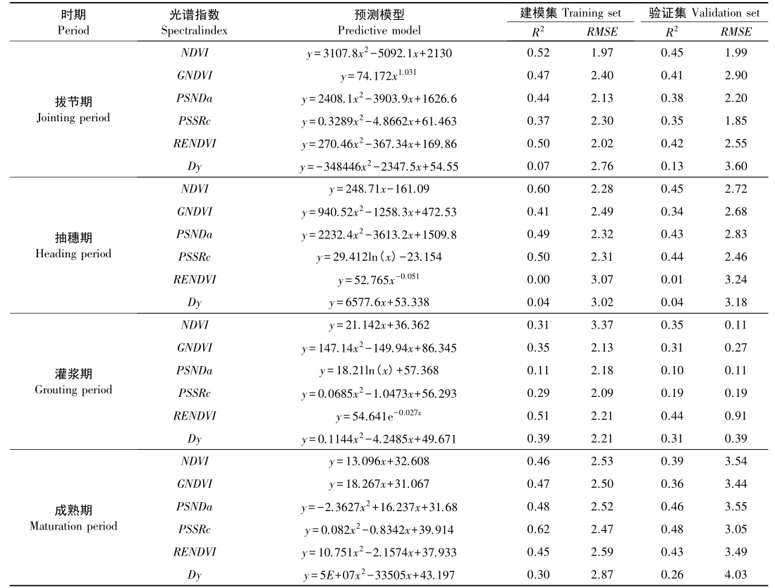 如表3所示,在不同生育期,分别基于一次线性、二次非线性、指数及对数形式构建各因子与叶绿素含量的对应关系。在拔节期和抽穗期NDVI与叶绿素含量有较好的对应关系(R2 > 0.52),估算值也具有最小的残差(RMSE < 2.28)。在灌浆期和成熟期,RENDVI、PSSRc则分别对叶绿素含量估算有较好的适用性。其中,NDVI的二次非线性、一次线性模型分别在拔节期和抽穗期表现良好;RENDVI、PSSRc则分别以一次线性及指数形式出现在灌浆期和成熟期。