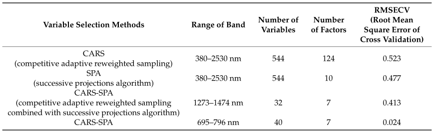 表2给出了CARS、SPA和CARS-SPA算法所选波段和RMSECV的比较。在表2中,使用CARS-SPA算法对光谱数据进行处理时,首先使用CARS对全波段进行滤波。在获得特征波段数据集后,利用SPA进行更详细的评估,最终获得最佳波长。当CARS和SPA算法单独处理全波段时,SPA算法构建的模型性能优于CARS算法,而采用CARS-SPA算法的模型的性能明显比前两个模型更准确。本研究结果表明CARS-SPA算法与CARS和SPA算法相比具有最少的特征数。因此,采用CARS-SPA算法不仅可以降低模型的复杂度,还可以提高模型的精度。