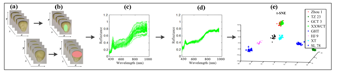 首先,获取每粒种子的两侧胚和非胚部分的高光谱影像(图1a);其次,选取感兴趣区域并计算其平均光谱(图1b);然后对光谱进行标定(图1c);采用PA算法对光谱数据进行预处理(图1d);最后,利用t-SNE等模型进行种子品种分类(图1e)。