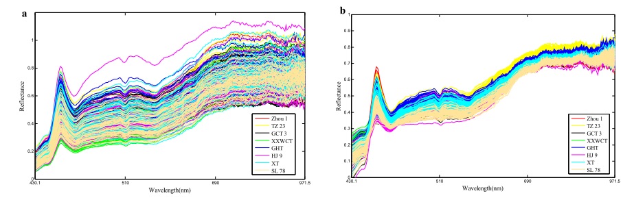 虽然在分析前对高光谱图像进行了校正,但噪声仍然存在(图3a)。对于同一玉米品种,由于光照和噪声的影响,所有的高光谱图像在光谱上沿波段散射。在这种情况下,不同类别的数据可能会重叠,最终也会影响分类模型。相同品种种子的高光谱图像的分布可能具有相同的变异和最小的偏差。PA算法的目的就是减小数据方差,使高光谱数据的差异最小化。该算法具有良好的性能,适用于原始光谱的预处理。得到的预处理光谱曲线如图3b所示。可以看出,PA预处理后的光谱更加聚集,重叠的数据变少,并且增强了原始光谱的信息。