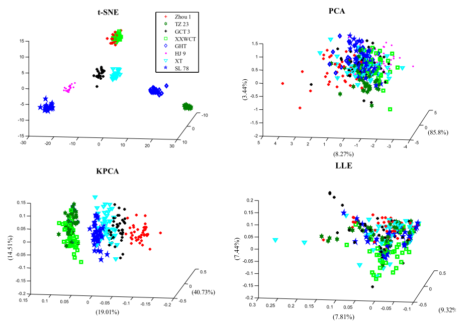 8个玉米品种降维后的三维分布如图4所示。对于PCA,不同品种之间没有明显的分离,同一类样品沿空间分布并重叠。LLE的散点图与PCA的散点图基本相同。KPCA的区分效果优于PCA和LLE,但较t-SNE差。t-SNE表现优异,品种TZ23、GCT3、GHT、HJ9、XT和SL78的分布和区域有明显区别,而Zhou1和XXWCT在同一分布区域并有一定的重叠。这是由于t-SNE在捕获局部数据特征和区分数据结构方面有一定优势。具有相似几何结构的糯玉米种子的高光谱图像基本是相似的,图中相邻的光谱曲线具有高度的相关性。因此,利用光谱曲线的局部特征可以更容易地表示数据的变化。