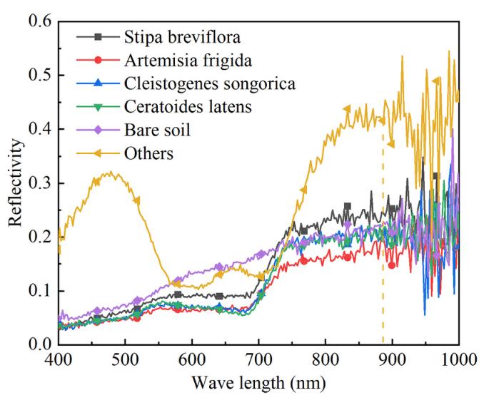 内蒙古农业大学杜健民教授团队利用Gaiasky-Mini-VN高光谱相机(江苏通宝TB888公司)获取了研究区内不同地物品的高光谱影像,其波段范围为400 ~ 1000 nm,波段数为256。各类地物的光谱曲线如图1所示。其他地物类型(垫子、小旗和垃圾)的光谱曲线与其余5种地物的光谱曲线差异最大。裸地光谱曲线在550 ~ 740 nm范围内呈缓慢线性增长,与4种植被的特征差异显著。580 nm后,短花针茅的光谱曲线与其余3种植被的光谱曲线存在一定差异。闭锁蓟、冷蒿和驼绒藜的光谱曲线相似度较高。在886.6 nm之后,由于噪声的影响,不同地物的光谱曲线都表现出较大的波动,最终获得的频带数为205个。