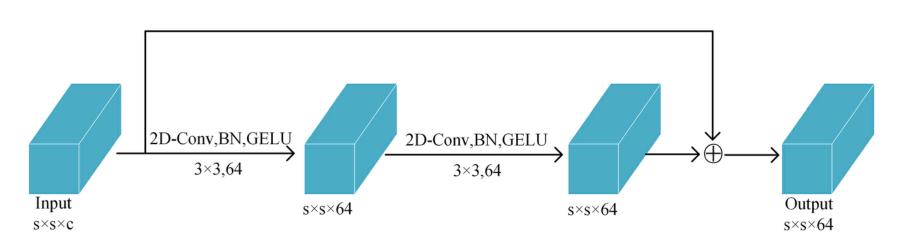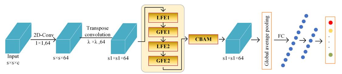 LGFEN由3个主要模块组成:LFE模块、GFE模块和CBAM模块。其结构如图5所示。在网络中,主要采用核大小为1 × 1的二维卷积对HSI进行降维,以减少高维数据的冗余信息,经过该卷积层后,数据的通道维数降为64。然后,通过转置卷积对降维后的数据进行自适应上采样,以拟合GFE模块中子patch的采样过程。随后,上采样数据通过LFE和GFE模块来学习HSI的局部和全局特征。最后,通过CBAM模块对学习到的特征进行细化,增强网络性能的稳定性。所有特征学习完成后,通过全局平均池化层对空间特征进行聚合,最后通过两个FC层进行最终分类。