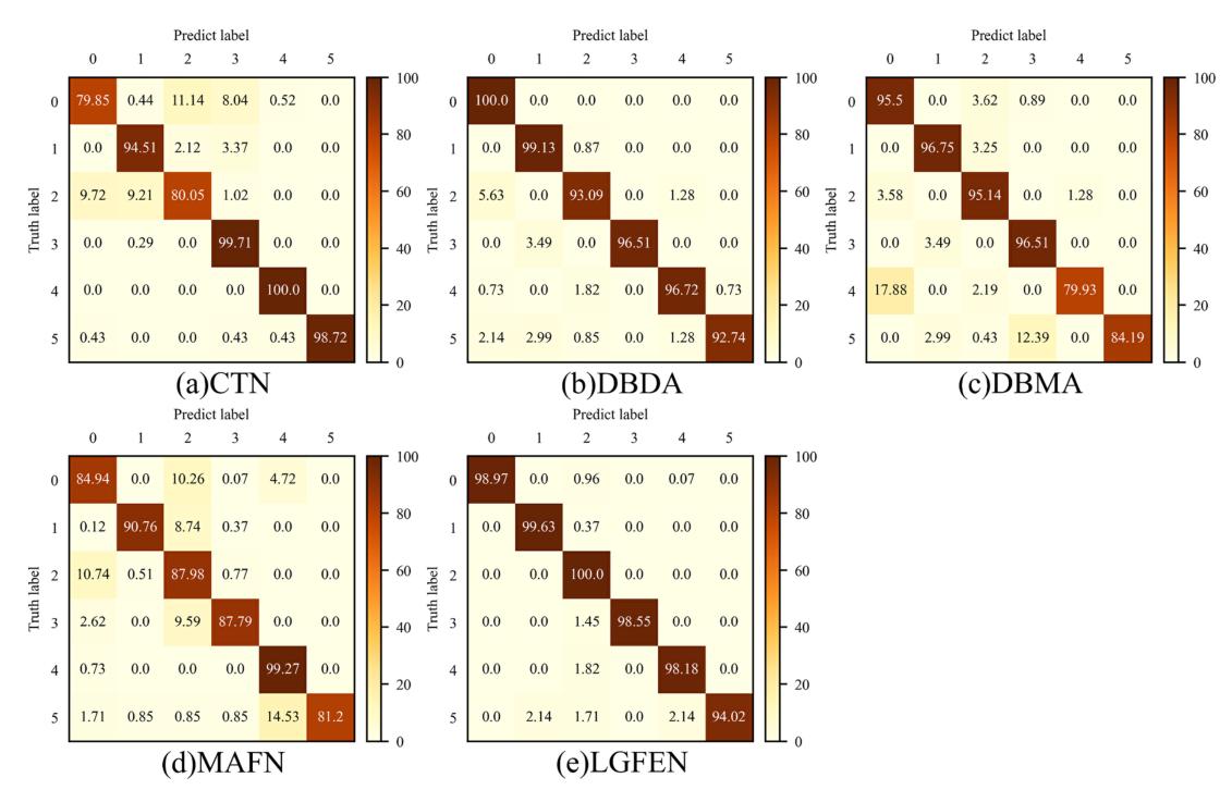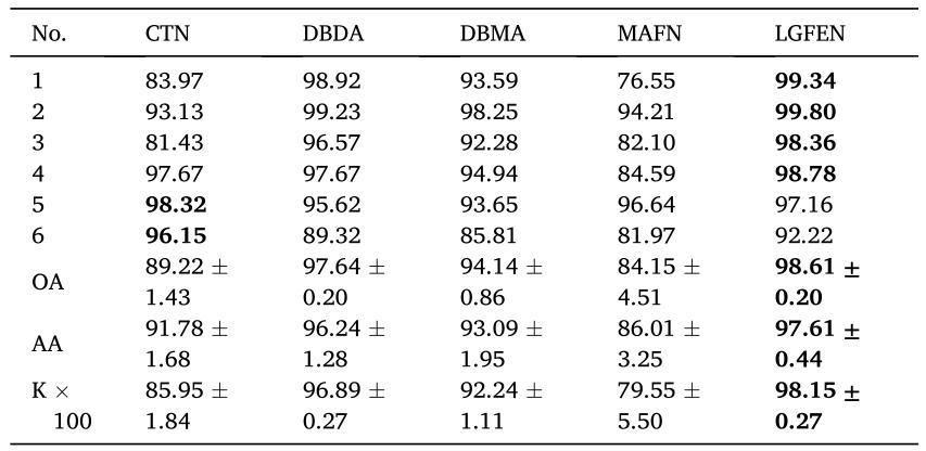 为了更好地评估本文提出的LGFEN网络的有效性,我们选择了几种最新的HSI分类方法进行比较,包括CTN、DBDA、DBMA和MAFN。从图6可以看出,本文提出的LGFEN方法对不同草地物种的分类效果*好,在所有方法中错分率最低。