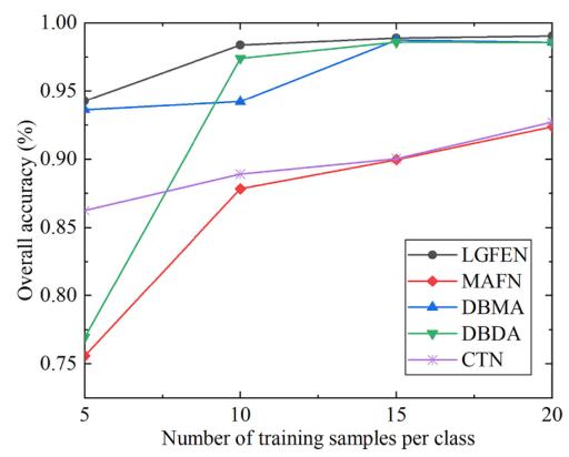 此外,为了验证LGFEN在小样本下的特征提取能力,我们对不同数量的训练样本进行了实验。在实验中,每个类别的训练样本数量分别设置为5个、10个、15个和20个。结果如图7所示。从图中可以看出,随着训练样本数量的增加,不同分类方法的分类准确率逐渐提高。同时,LGFEN的分类准确率仍然是最高的,说明本文提出的LGFEN在小样本下具有更好的鲁棒性和适应性。