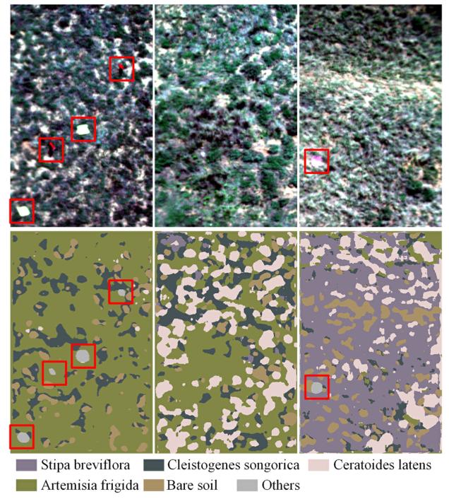 为验证LGFEN在荒漠草原物种识别中的有效性,选取3个样本进行可视化分析,如图9所示。从图中可以明显看出,其他地面物体和裸地物体被有效识别。通过对比人工野外调查记录和无人机航拍RGB拼接图像,3个样本的分类结果与实际地物的空间分布相匹配,分类性能良好。有效地区分了不同的地物,较好地保留了地物的空间特征。这表明LGFEN在荒漠草原物种的识别和分类方面具有良好的泛化能力。本研究为荒漠草原退化监测提供了一种新的方法,可为今后的研究提供理论参考。