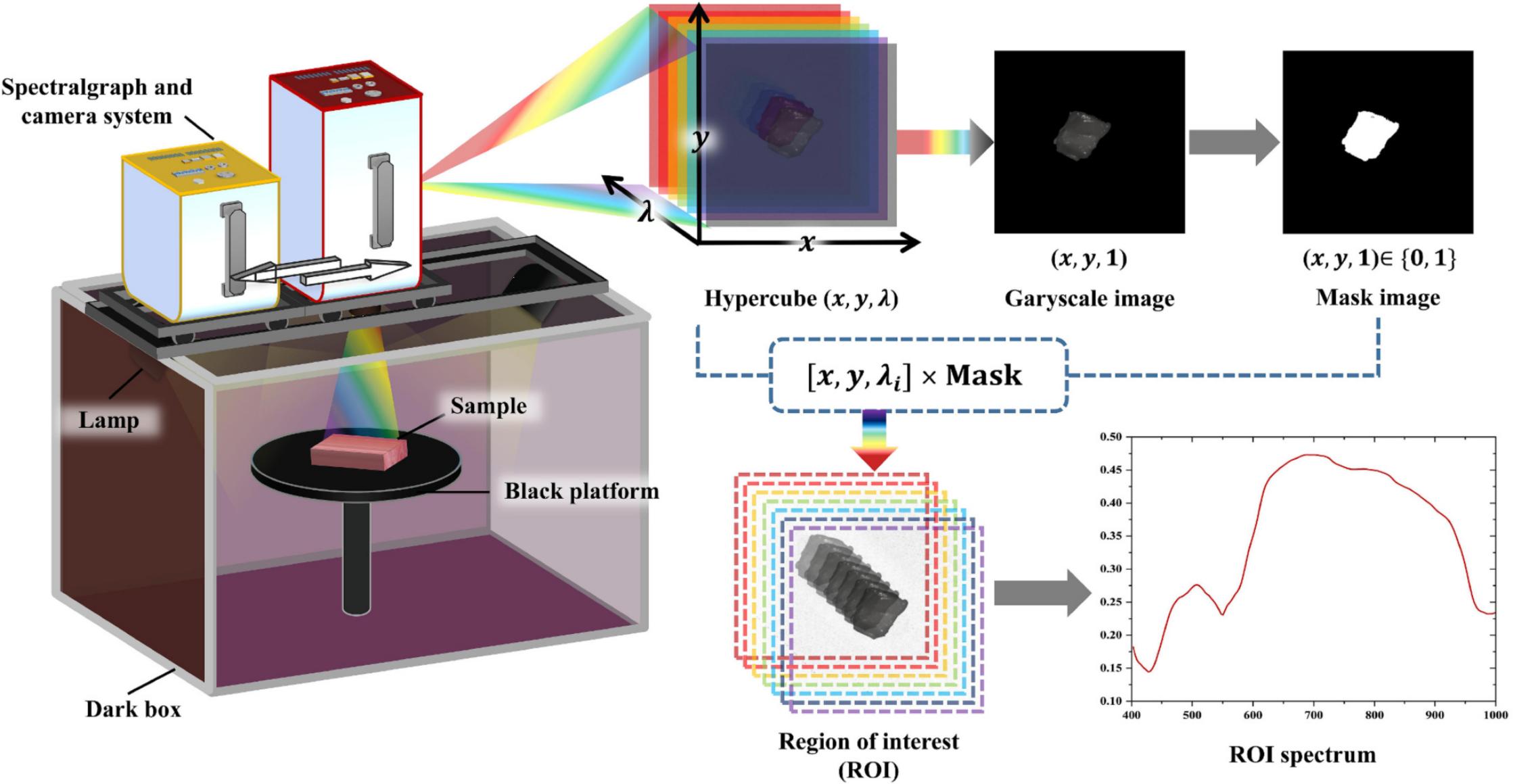 该研究从广州当地市场随机购买了100只新鲜的鸡胸脯肉,用无菌刀具从鸡胸脯肉中心切下约30mm×30mm×20mm的立方体,共得到240个新鲜鸡肉样品。然后,将所有样品均单独放置在无菌一次性塑料盒中并贴上标签。最后,将样品储藏在4℃的环境下,在储藏的第0、2、4、6、8、10、12和14天随机抽取了30个样品用于高光谱图像采集和其对应的理化值(TVB和TVC)测定。其中,利用了GaiaField-Pro-V10E型和GaiaField-Pro-N17E型高光谱相机采集了不同储藏期鸡肉样品的高光谱图像,使用图像处理技术提取了鸡肉样品区域的平均光谱数据,光谱数据提取流程如图1所示。