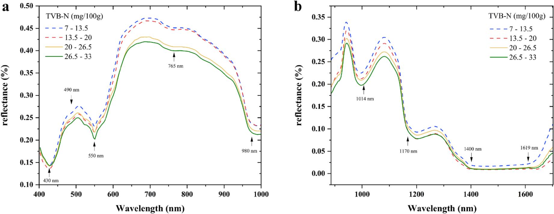图3 TVB-N含量不同范围的平均光谱曲线(a:Vis-NIR,b:NIR)