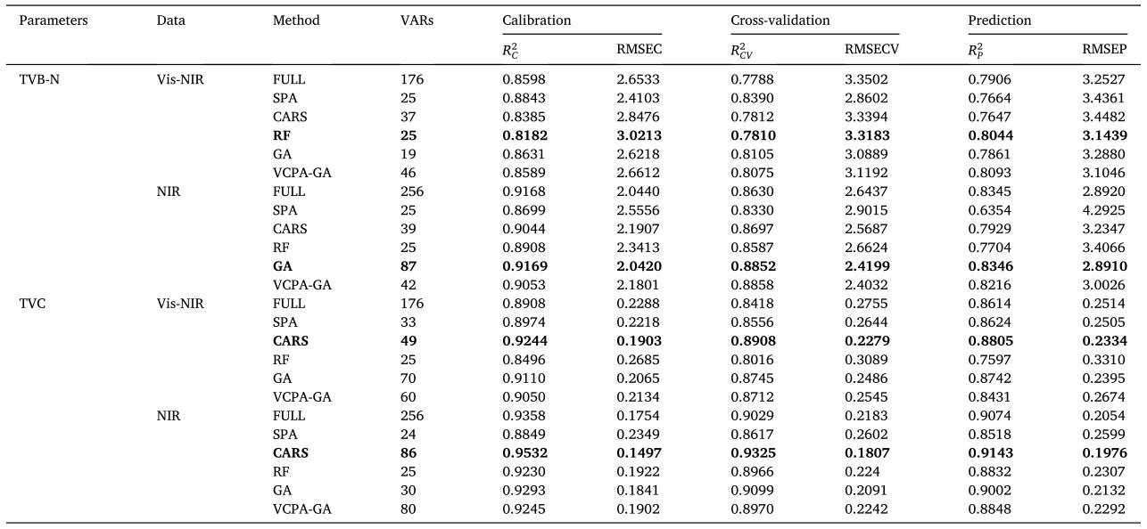 4)单数块(Vis-NIR、NIR)建立的PLSR模型分析。该研究使用了连续投影算法(SPA)、竞争性自适应加权算法(CARS)、随机森林(RF)、遗传算法(GA)和变量组合集群分析法联合遗传算法(VCPA-GA)五种特征提取方法分别提取了Vis-NIR、NIR光谱范围的特征波长,并建立PLSR模型预测鸡肉的TVB-N含量和TVC含量,建模结果如表1所示。对于鸡肉的TVB-N含量预测而言,使用GA方法提取NIR光谱范围内的87个特征波长建立的模型预测TVB-N含量精度*高,其RP2和RMESP分别为0.8346,2.8910,这与全光谱建模的结果相似,而与256个全光谱波长相比,波长数量减少了近66.02%。对于鸡肉的TVC含量预测而言,使用CARS方法提取NIR光谱范围内的86个特征波长建立的模型预测TVB-N含量精度*高,其RP2和RMESP分别为0.9143,0.1976,这与全光谱建模的结果相似,而与256个全光谱波长相比,波长数量减少了近66.40%。总的来说,尽管特征波长提取方法没有显著改善模型的预测性能,但它显著减少了波长的数量,这是非常有意义的。