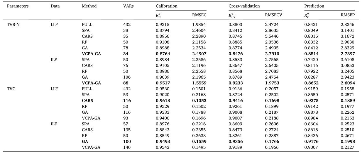 3)光谱数据预处理及结果分析。由于光谱数据包含仪器和检测条件引起的噪声和杂散光等干扰信息,该研究利用了高斯滤波平滑(GFS)、Savitzky–Golay平滑(SGS)方法、最小二乘拟合导数系数、一阶导数(FD)、二阶导数(SD)和标准正态变换等七种不同预处理方法分别对Vis-NIR、NIR和LLF的全光谱数据进行了预处理并建立了PLSR模型。根据校正集、交叉验证集和测试集的决定系数(RC2、RCV2和RP2)、以及均方根误差(RMSEC、RMSECV和RMSEP)分别确定了Vis-NIR、NIR和LLF光谱数据对TVB-N含量的*佳预处理方法为SNV、SD和SD,TVC含量的*佳预处理方法为Nor、GFS和NOR;并使用*佳预处理方法进行后续的研究。