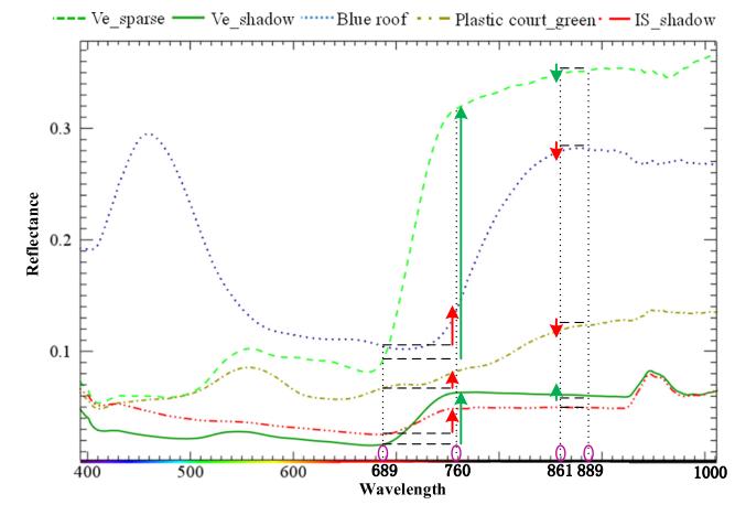 从760 nm处的绿色箭头可以看出(图1),760 nm和689 nm两个波段的植被光谱值变化明显。相比之下,非植被地物的光谱值变化较小。植被在阴影下的光谱值在889 - 861 nm波段呈上升趋势(861 nm处绿色箭头)。然而,非植被地物有相反的趋势。因此,通过四波段组合构建EVI来增强阴影下的植被信息。由于861 nm和889 nm两个波段的差值太小,我们设置增强系数α。公式如下所示。
