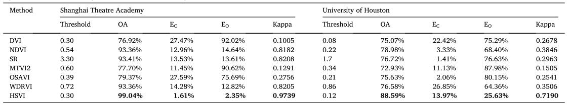 对于表1中的上海戏剧学院数据集,DVI、MTVI2和OSAVI的OA和Kappa最低。它们的EO值非常高,说明遗漏了一些植被。NDVI、SR和WDRVI精度*高。他们的EC和EO更高。这表明他们将非植被表面错误地标记为植被。相比之下,HSVI的植被提取精度最高。HSVI具有最低的EC和EO,显示了其在减少阴影和新材料对分类结果干扰方面的优势。对于休斯顿大学数据集,只有HSVI获得了*好的植被提取精度。相反,其余6种VIs获得了较高的EO值,表明它们在阴影条件下的性能较差。因此,我们可以得出结论,HSVI改善了复杂条件下的植被提取。