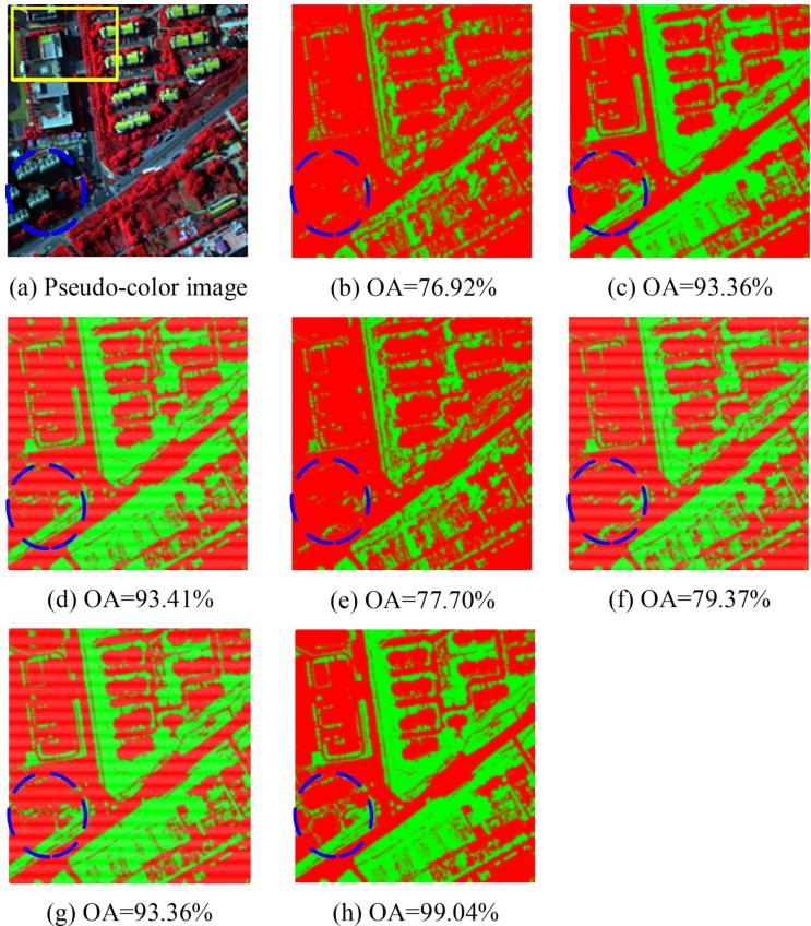 图4进一步验证了HSVI在复杂环境下提取植被的优势。椭圆区域表示植被被遮蔽的地方,矩形区域包含容易被误分类为植被的合成表面。从图4c、f和g可以看出,由于阴影的干扰,NDVI、SR和WDRVI的植被提取结果较差。在图4d、e和h中,NDVI、SR和WDRVI能够从阴影中提取植被。然而,他们很容易将其他特征误认为植被。相比之下,HSVI的植被提取效果*好。结果表明,HSVI中的EVI有效增强了阴影植被,避免了与合成材料的光谱混淆。