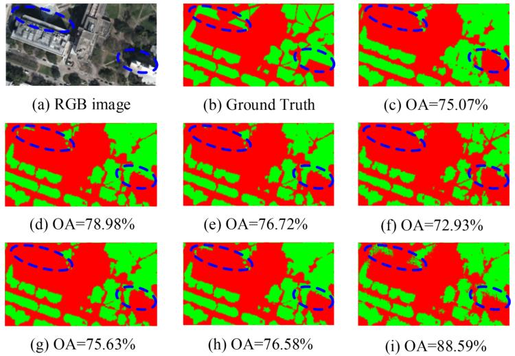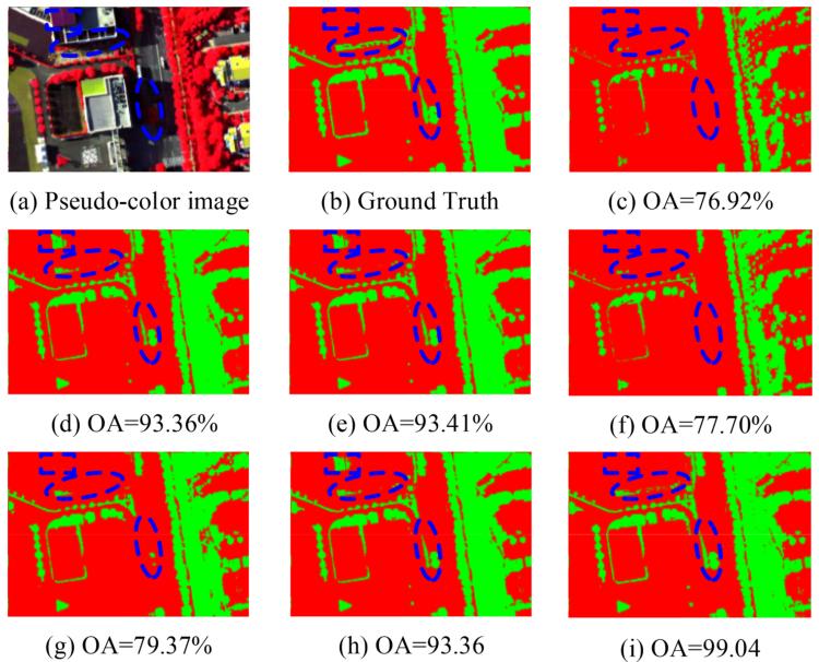 图5c - i为7个VIs的植被提取结果。从图5a和b中可以看出,在椭圆虚线框中,大面积植被被阴影覆盖。从图5c - h可以看出,其他方法提取椭圆区域的植被效果较差。然而,HSVI*大程度地提取了阴影下的植被(图5i)。这说明HSVI中的EVI能有效增强阴影植被信息,有利于植被提取。与其他指数相比,HSVI在航空HSI数据上表现良好。