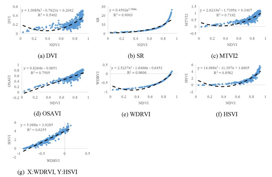 为了验证HSVI的不敏感性,我们比较了其他VIs与NDVI的相关性。从图6a、c、d的散点图分布可以看出,DVI、MTVI2、OSAVI与NDVI的相关性非常低,分布不均匀。结果表明,它们的不敏感性弱于NDVI。由图6b、e、f可知,SR、WDRVI、HSVI与NDVI具有较高的相关性,拟合函数为曲线分布。结果表明,它们的不敏感性大于NDVI。同时,从图6g可以看出,HSVI可以达到与当前最佳指数相同的水平。
