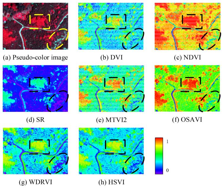 为了更直观地比较各VI的不敏感性,我们在大珠山数据集上获得了不敏感性结果(图7)。从图7a可以看出,椭圆区多为裸岩,稀疏植被。但NDVI、MTVI2、OSAVI值均在0.5以上,如图7c、e、f所示,属于高估。从图7b中的矩形区域可以看出,DVI中的纹理特征是由阴影引起的。从图7d可以看出,SR低估了整体植被分布。相比之下,图7g和h中的WDRVI和HSVI效果更好,可以在植被覆盖饱和的矩形区域有较好区分结果。因此,在无人机HSI上,HSVI对植被的表征不敏感性较高。