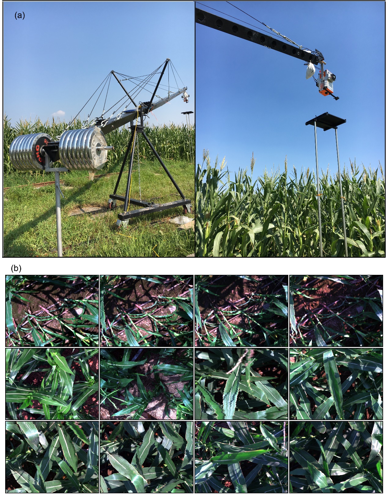 图1近地面高分辨率成像数据集的观测系统的现场照片和植被成像光谱数据实例。(a)光谱相机GaiaField-F-V10安装在固定的轨道臂上,并提升到距离冠层顶部约2米的高度。(b)不同光照条件下的真彩色合成影像示例,按低(第一行)、中(第二行)和高(第三行)覆盖度进行分类。