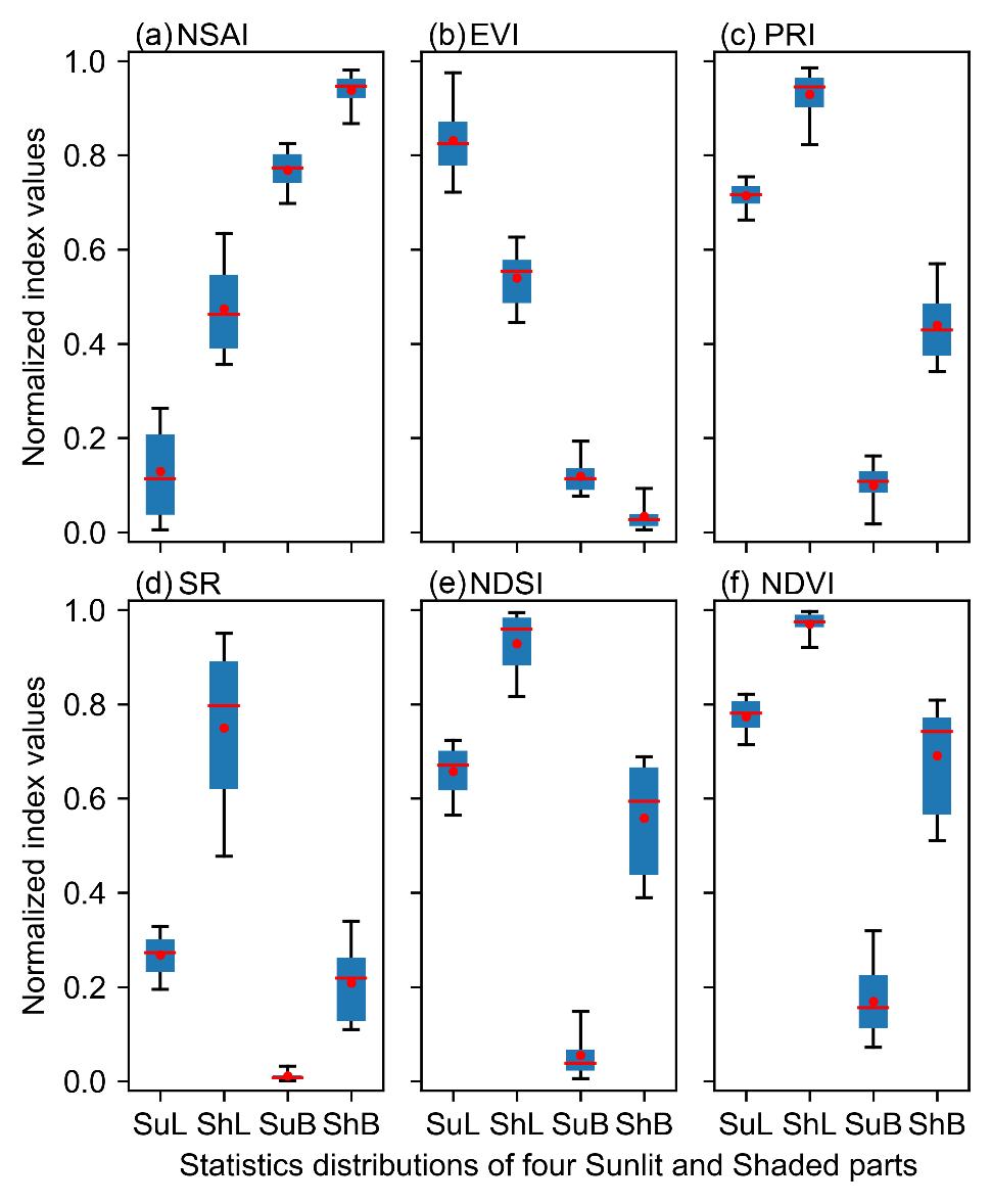 图2阳叶(SuL)、阴叶(ShL)、光照背景(SuB)和阴影背景(ShB)的6个光谱指数的箱形图:不同光谱指数都归一化到0~1的范围。红色点表示指数均值,红色线表示中位数,蓝色框表示[25%,75%]百分位数,黑色须分别表示5%和95%百分位数。以上统计特征值根据高分辨率影像数据的监督分类结果计算获得。