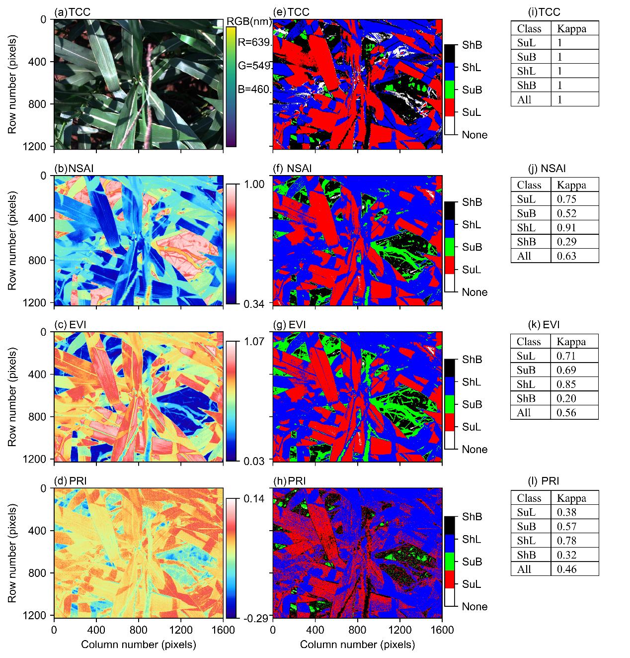 图3阳叶(SuL)、阴叶(ShL)、光照背景(SuB)和阴影背景(ShB)的高分辨率影像分类结果图,(a)高分辨率成像数据的真彩色合成图(TCC),(b-d) NSAI、EVI和PRI指数图像,(e)高分辨率图像的监督分类结果,(f-h)分别基于NSAI、EVI和PRI指数图像的非监督分类结果,(i-l)非监督分类结果和参考值(即监督分类结果,假设监督分类结果代表真实值)的kappa系数。