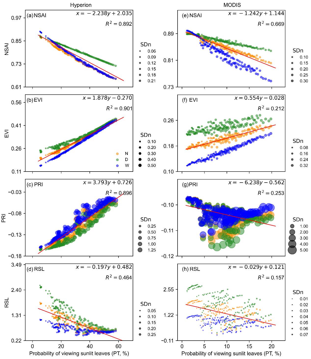 图4模拟的Hyperion(a-d)和MODIS(e-h)场景下,NSAI、EVI、PRI和RSL(红波段上冠层反射率与叶片反射率的比值)指数与PT的相关性,点的颜色表示不同土壤类型:正常土壤(N,橙色点)、干土壤(D,绿色点)、湿土壤(W,蓝色点)。Hyperion样本数量为13,950,144个,其中模拟场景数量为10,764;MODIS样本数量为3,732,480个,模拟场景数为2,880个;每个点代表432个具有不同叶片光谱和相同PT的样本的平均值,点的半径为具有相同PT的432个样本中对应指数的归一化标准差SDn值。