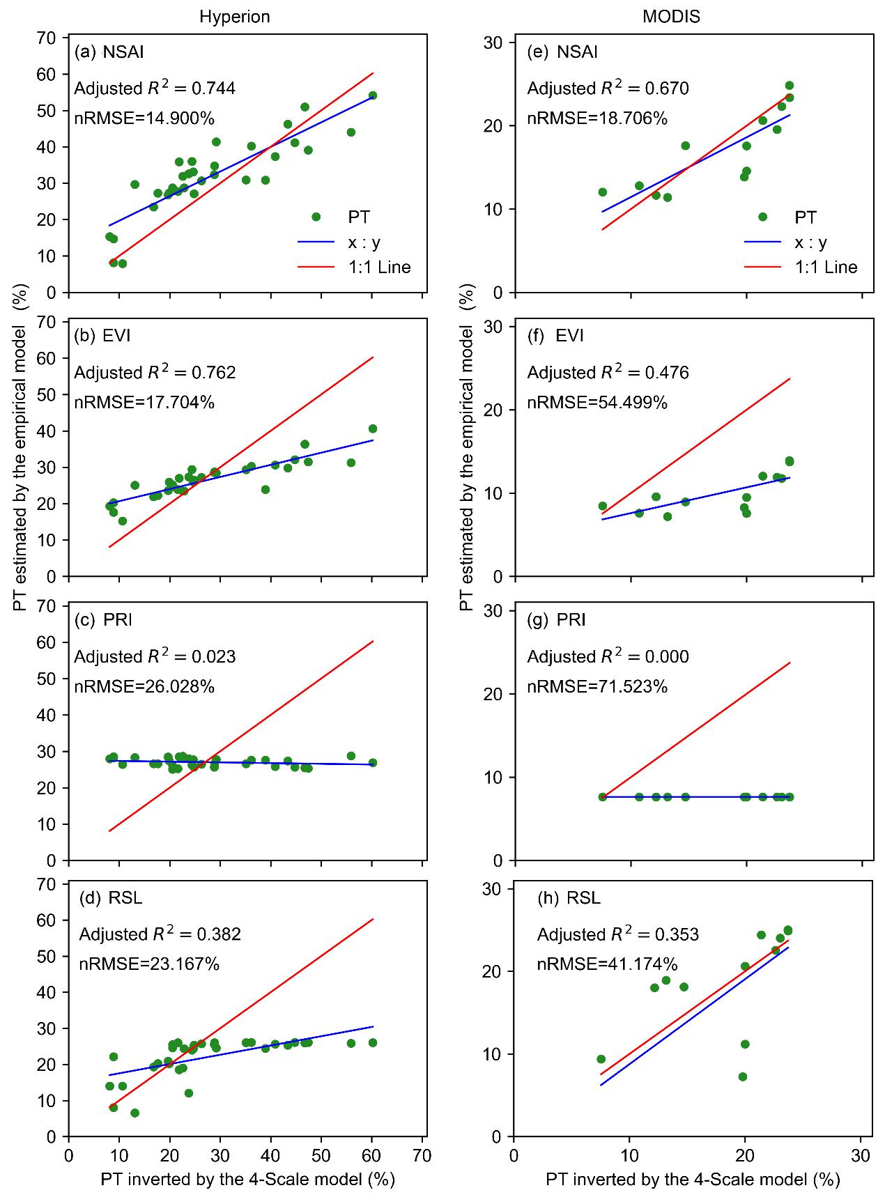 将利用模拟数据校准的基于NSAI的PT估算模型应用于高光谱-高空间分辨率的Hyperion数据时,估计的PT的归一化均方根误差(nRMSE)和调整R2分别为14.9%和0.744。应用于中分辨率的MODIS影像时,PT的估计精度也非常令人满意,nRMSE为18.71%,调整R2为0.67(图5)。表明NSAI有巨大希望应用于卫星影像直接估算PT,提高植被参数的反演精度。