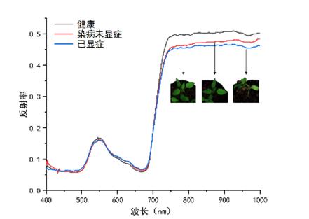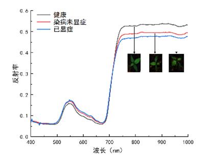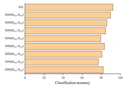 结论:图1为辣椒在400 ~ 1000 nm范围内的平均光谱标准差曲线及其对应的叶片状态的图片。结果表明两类辣椒品种样品的光谱曲线趋势差异很小,差异主要集中在550-650和750-850的波长区间内。550-650的波长区间内的光谱信息通常用于表征植被特征如植被的生长情况和健康状况等,可以用于衡量叶绿素的含量。山椒4号的患病期样本的光谱反射率下降趋势更加明显,表征患病期样本和其他样本差异性大,可能在受根腐病胁迫时失去了更多的叶绿素。在750-850的波段区间内,满山红的潜伏期叶片样本的反射率有从低到高增加的趋势,潜伏期样本和健康期样本的光谱反射率差异大,和患病期样本的差异小,可能是潜伏期失水较多,使这一品种的辣椒的健康期叶片和潜伏期叶片差别较大。山椒4号的潜伏期叶片样本的光谱反射率则更加平缓。总体而言,两个品种的辣椒光谱曲线趋势基本相似,所以这个论文把两类辣椒品种合并在一起进行建模研究。这样做,能增加病害早期检测模型的可移植性,使这个研究的实验结果可以应用到其他辣椒品种中。观察图2不难发现健康辣椒叶片和染病辣椒叶片在550nm、580~680 nm和760~1000nm波长范围内的光谱反射率有明显的区别。这种显著性的差异证实了高光谱成像技术在识别叶片病变方面的有效性(10)。进一步分析表明,健康期辣椒叶片反射率最高,发病期的辣椒叶片的光谱反射率明显低于潜伏期辣椒叶片的光谱反射率。在580~680nm范围内,健康期叶片的反射率较低,而且随着患病程度的加重,该范围内的反射率逐渐减小。染病(包括潜伏期和发病期)的叶片在近红外波段的光谱反射率明显低于健康叶片的反射率,且随着辣椒叶片患病程度的加深,近红外波段范围内的反射率逐渐减小,这是由于病菌引起根茎细胞结构破坏而导致的叶片含水量和叶绿素含量下降造成的。