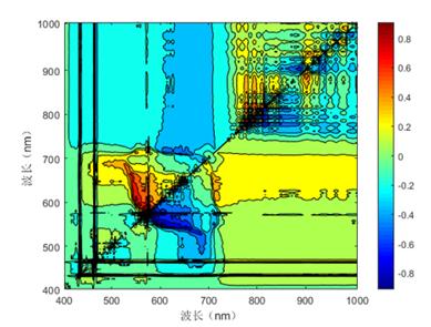 将所有辣椒样本按健康期、潜伏期和发病期三类进行赋值分类,将辣椒叶片样本在400nm到1000nm任意两波段下反射率计算出的NDSI值,利用皮尔森算法(Pearson correlation coefficient)与其对应的染病阶段进行相关性分析,将相关系数绘制成分布矩阵,如图4所示。