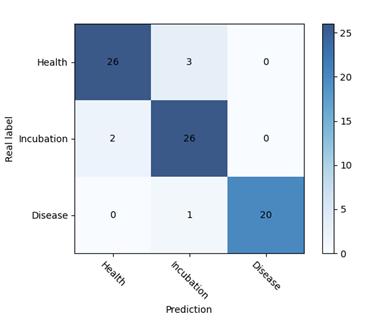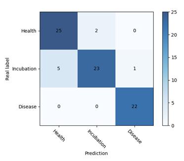 具体的训练结果在混淆矩阵图6所示,图6(a)是SPA的分类结果,其中29个健康样本有3个被误判为潜伏期,28个潜伏期样本有2个被误判为健康期,21个患病期样本被误判为潜伏期样本。图6(b)是光谱指数的分类结果,其中27个健康样本有2个被误判为潜伏期,29个潜伏期样本有5个被误判为健康期,有1个被误判为患病期。潜伏期和健康期叶片之间的误判大部分是山椒4号品种的辣椒,误判数为5个(共7个),仅仅有两个是满山红品种的辣椒,或许满山红辣椒的潜伏期和健康期的差别比山椒4号更大一些