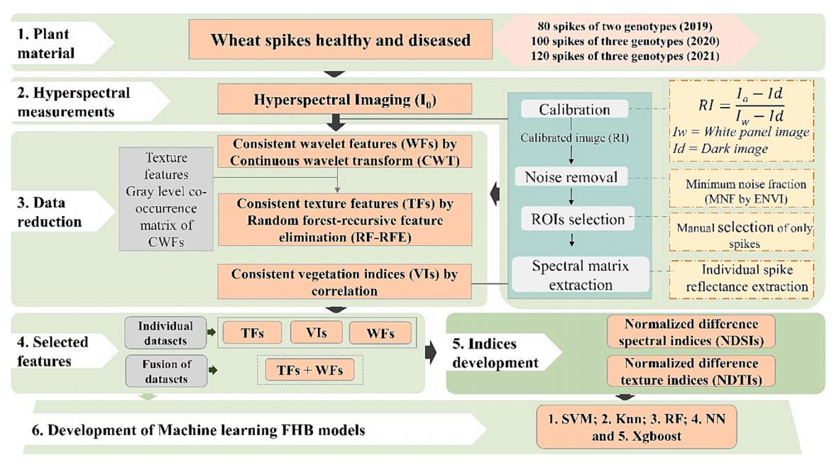 研究总体技术路线如图2所示:基于时序病害高光谱影像,利用连续小波变换进行特征选择,包括小波特征(WF)和纹理特征(TF);同时,还创建了赤霉病监测新型指数(WFSI和WTTI),再利用多种机器学习算法逐一将WF、TF和数据融合(DF=WFs+TFs)作为输入进行赤霉病识别,最终确定赤霉病估测模型。